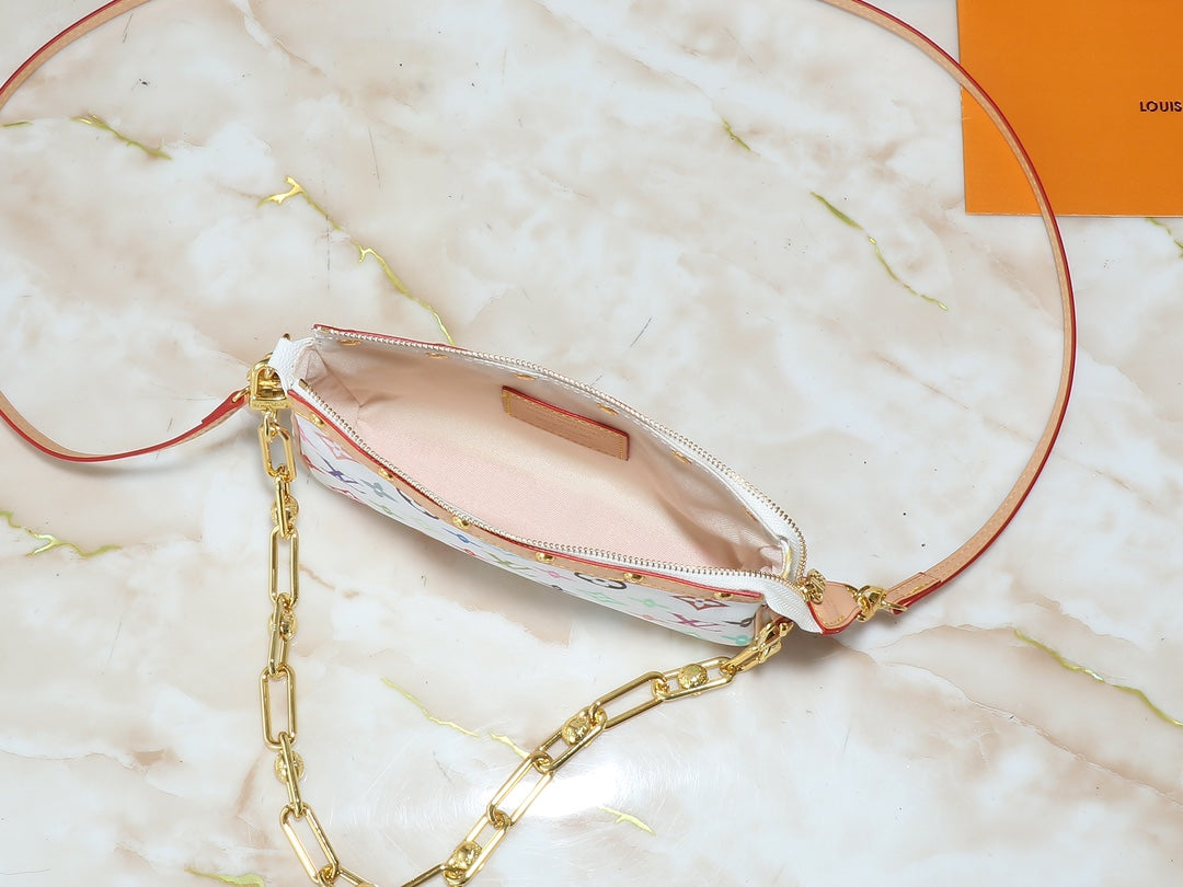 This Pochette Accessoires handbag is crafted from coated canvas, interpreting the vibrant style of the Louis Vuitton x Takashi Murakami collaboration with its colorful Monogram pattern. Leather trim and striking metal hardware highlight the refined details, while the detachable shoulder strap and chain allow for flexible carrying. Dimensions: 22.0 x 13.0 x 4.0 cm (Length x Height x Width)