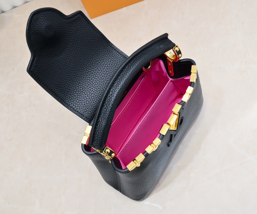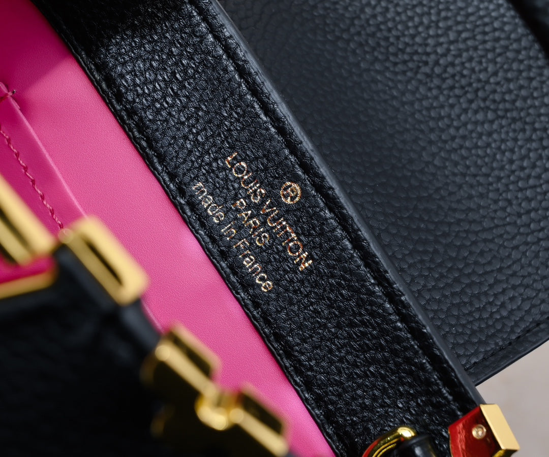 The Capucines Mini bag features a crown-shaped hardware design. The top edge of the leather body is wrapped with flowers, reminiscent of classic designs. The blooming Monogram flowers add a touch of glamour to the simple lines, making this Capucines mini handbag exude elegance and luxury.